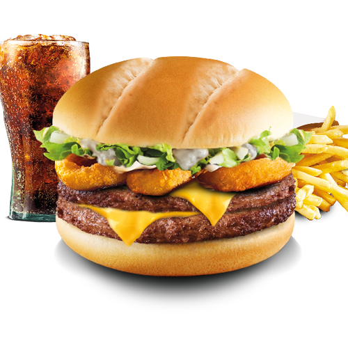 2 Steaks 90g, Oignons rings, Fromage, Sauce poivre, Crudités